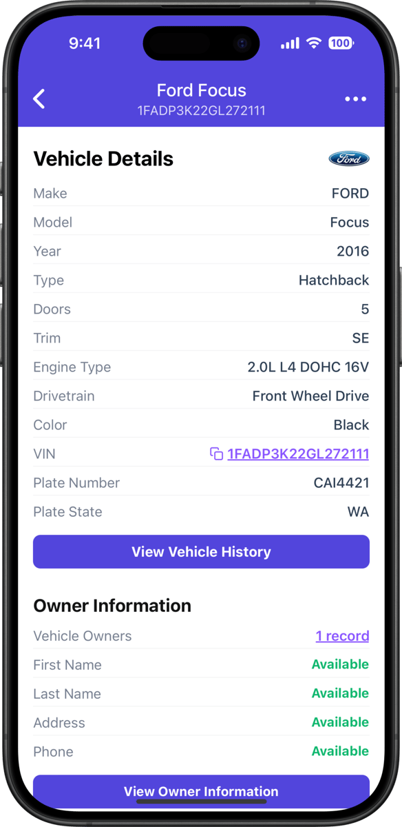 - Scan any license plate with your phone's camera and get complete vehicle information in seconds: VIN, make, model, year, trim, color, engine, transmission, recalls, sales records, auction records, photos, and much more.